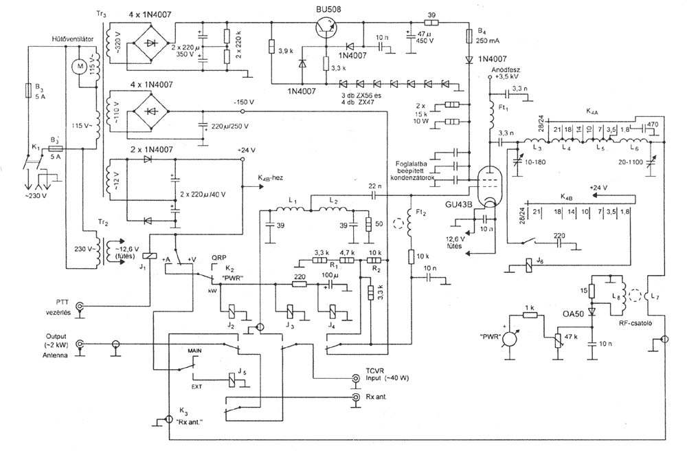 Режимы питания могу описать, нет проблемм: Анодное -1,2кВ, экран - 300V, смещение на сетке фиксированное, регулируемое по каждой лампе, 0-50V (минус ессно). Выпрямители серьезные, само собой трехфазные.
