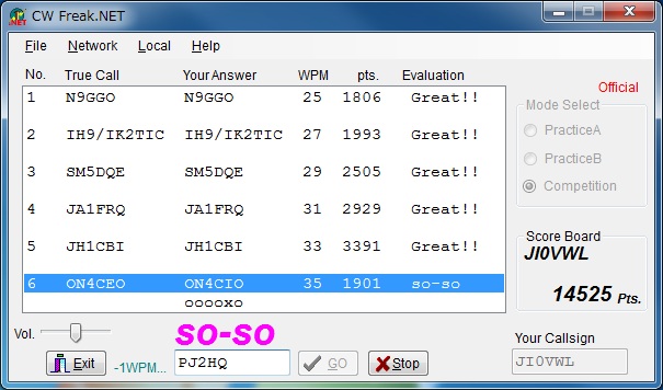 Уже отметился, но сырая ещё программа и очень....... Как можно достичь скорости в 91 WPM (по таблице достижений) если приняв все 25 позывных без ошибок можно достичь скорости только где-то чуть больше 70 WPM. А предварительных установок в соревновательном режиме нет. Они есть в тренировочных режимах. Да и штрафные санкции за неправильно принятый знак в позывном уж очень..... Сразу на 50% уменьшается очки за следующий позывной. RufzXP очень демократична и лучше её в таком формате вряд-ли то мжно придумать. К тому же у ней есть ещё куча функци не связанных с позывными, а и для начинающих при изучении азбуки, да и много других...